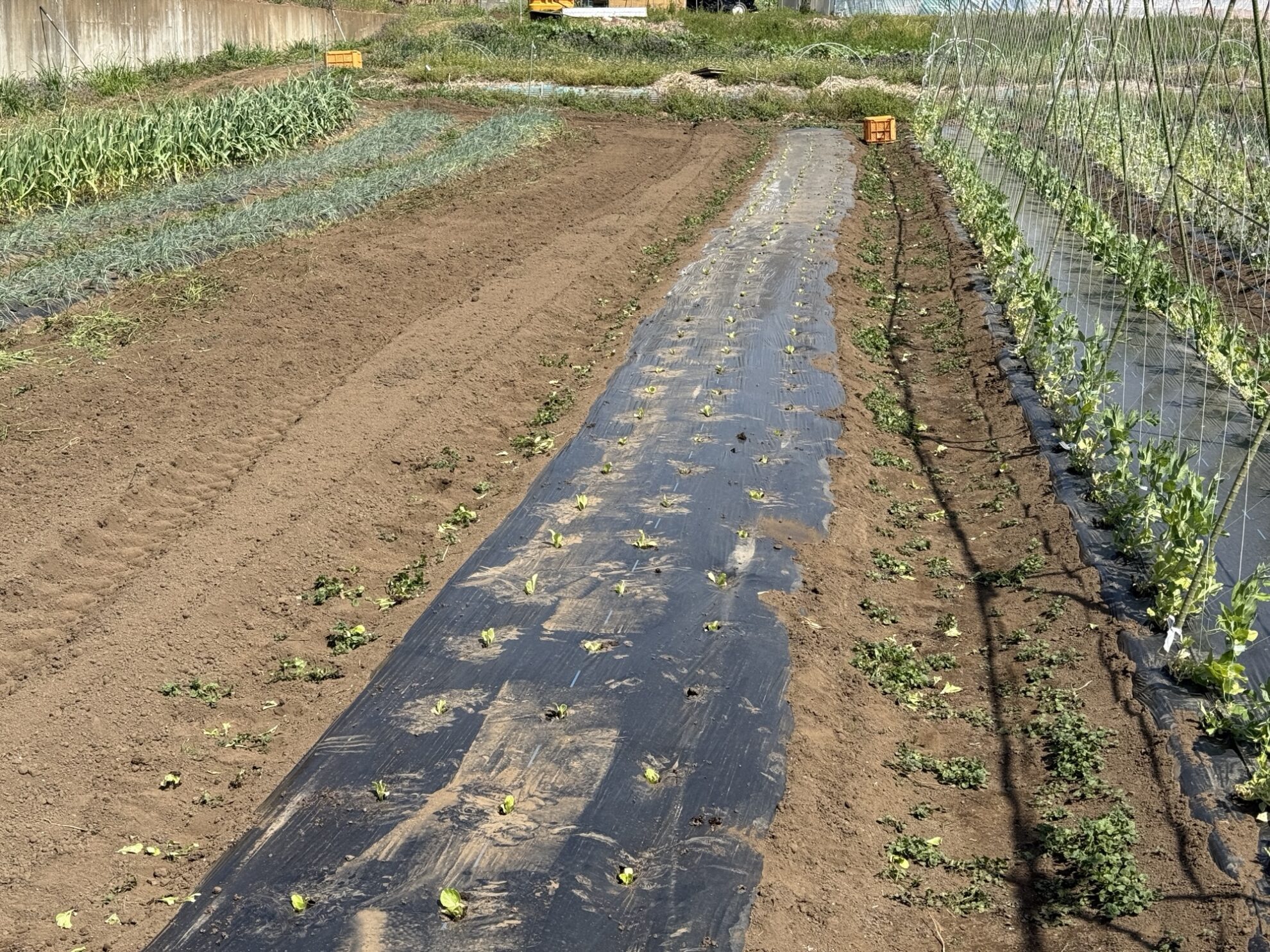斉藤さんの下の畑で、玉レタスの定植作業。