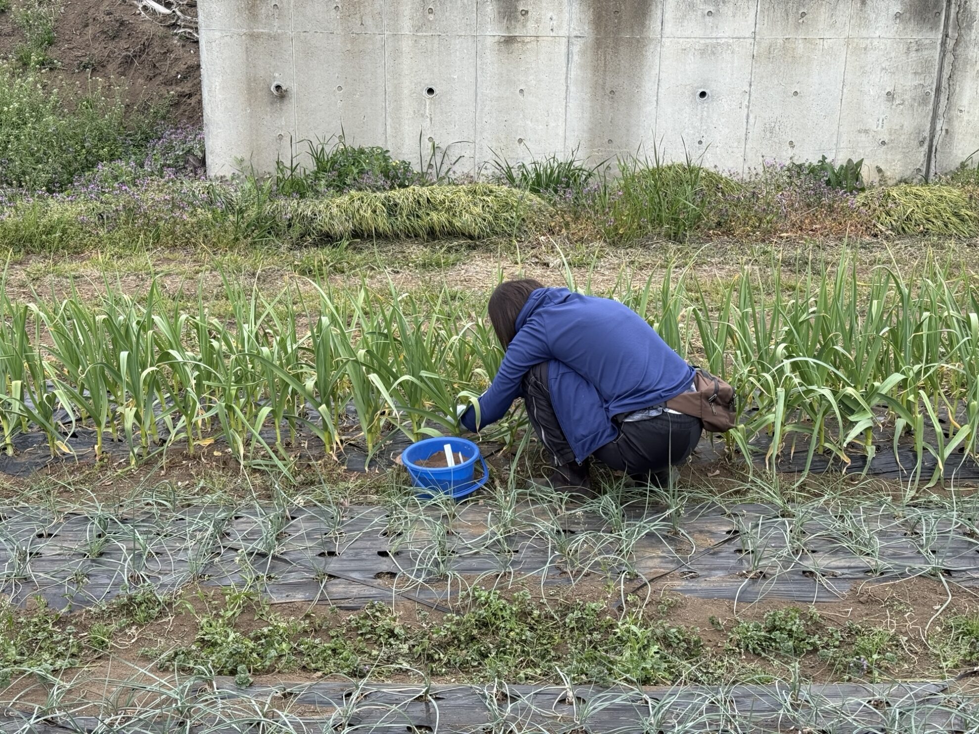 斉藤さんの下の畑で、ニンニク、らっきょうの除草と追肥作業。
