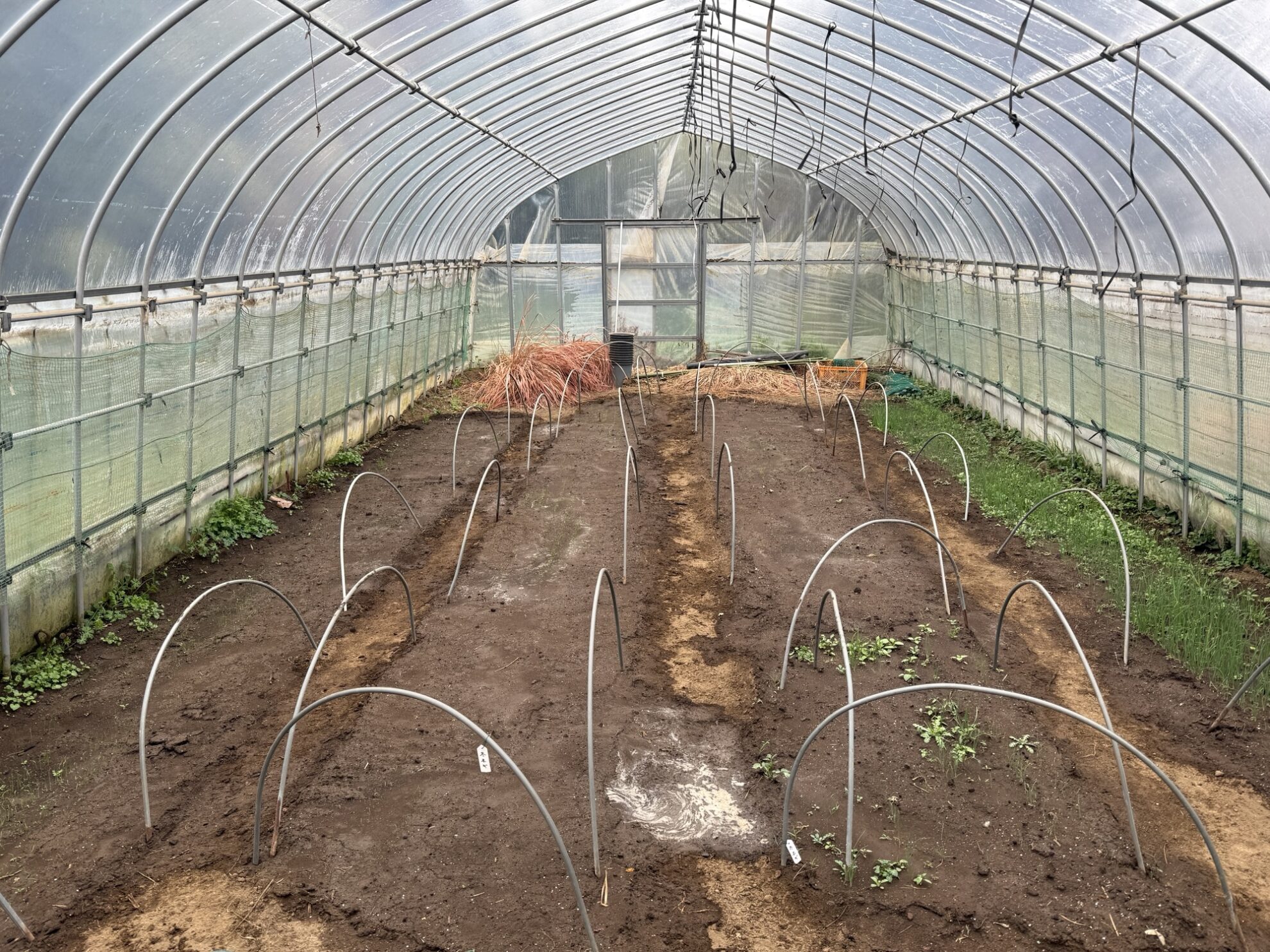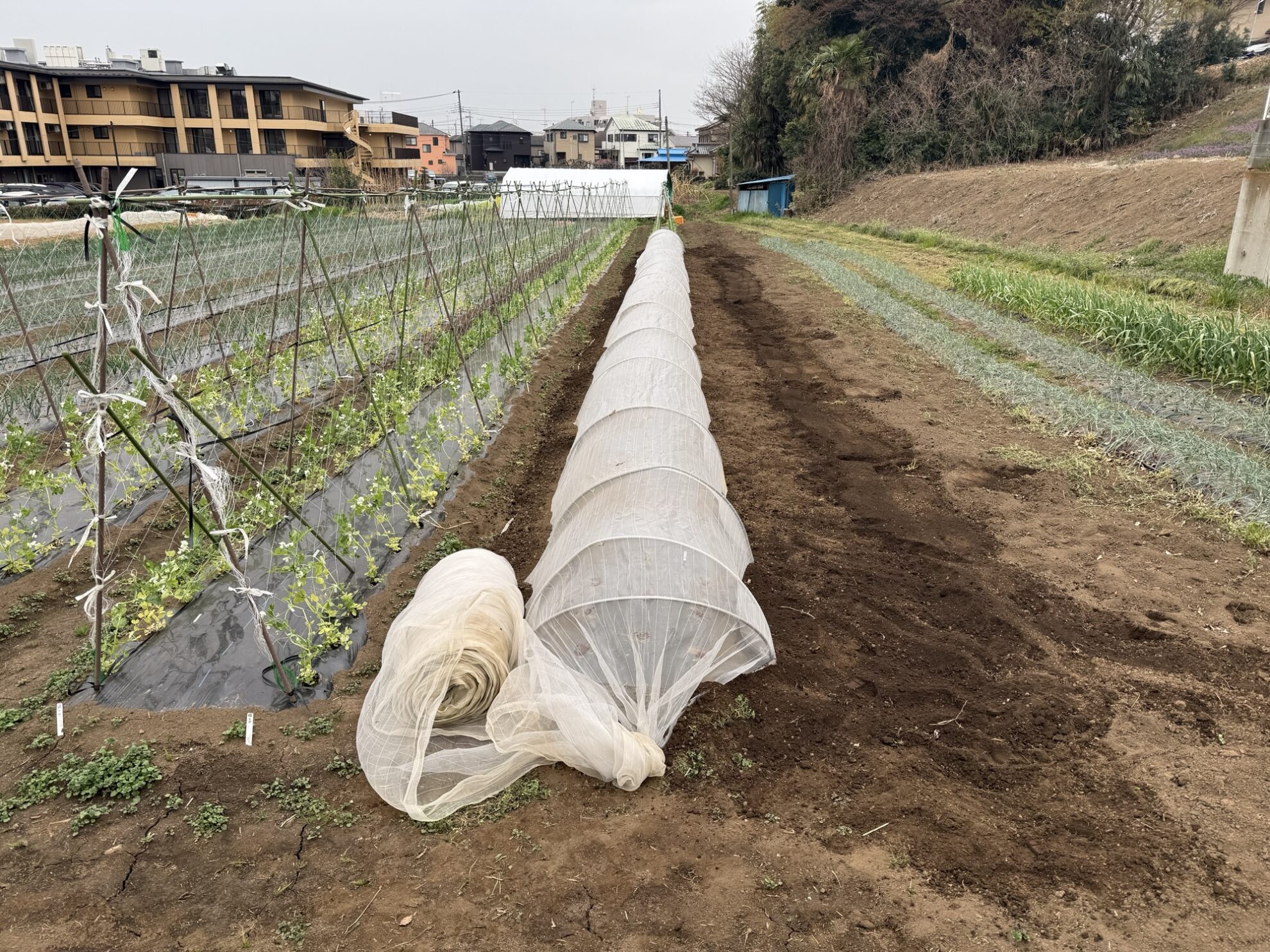 2026年3月25日(水)の作業記録 (そら豆・玉レタス・サニーレタス用に防虫ネット張り作業、玉ねぎ・ニンニク・らっきょうの追肥作業)