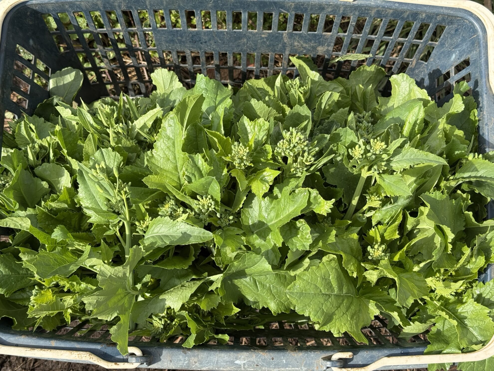 斉藤さんの最下段畑で、わさび菜の菜花、寒咲花菜、のらぼう菜の収穫作業。