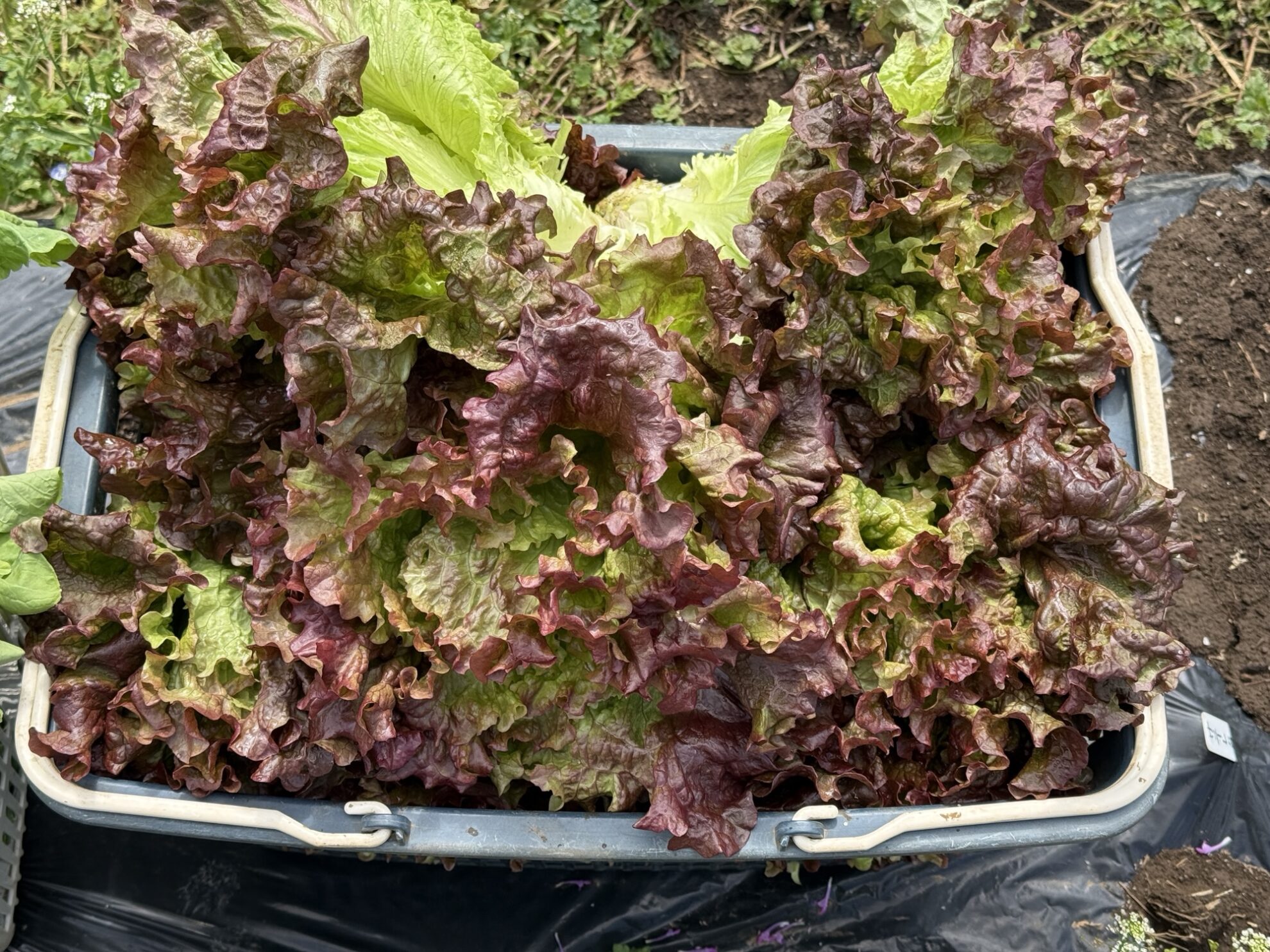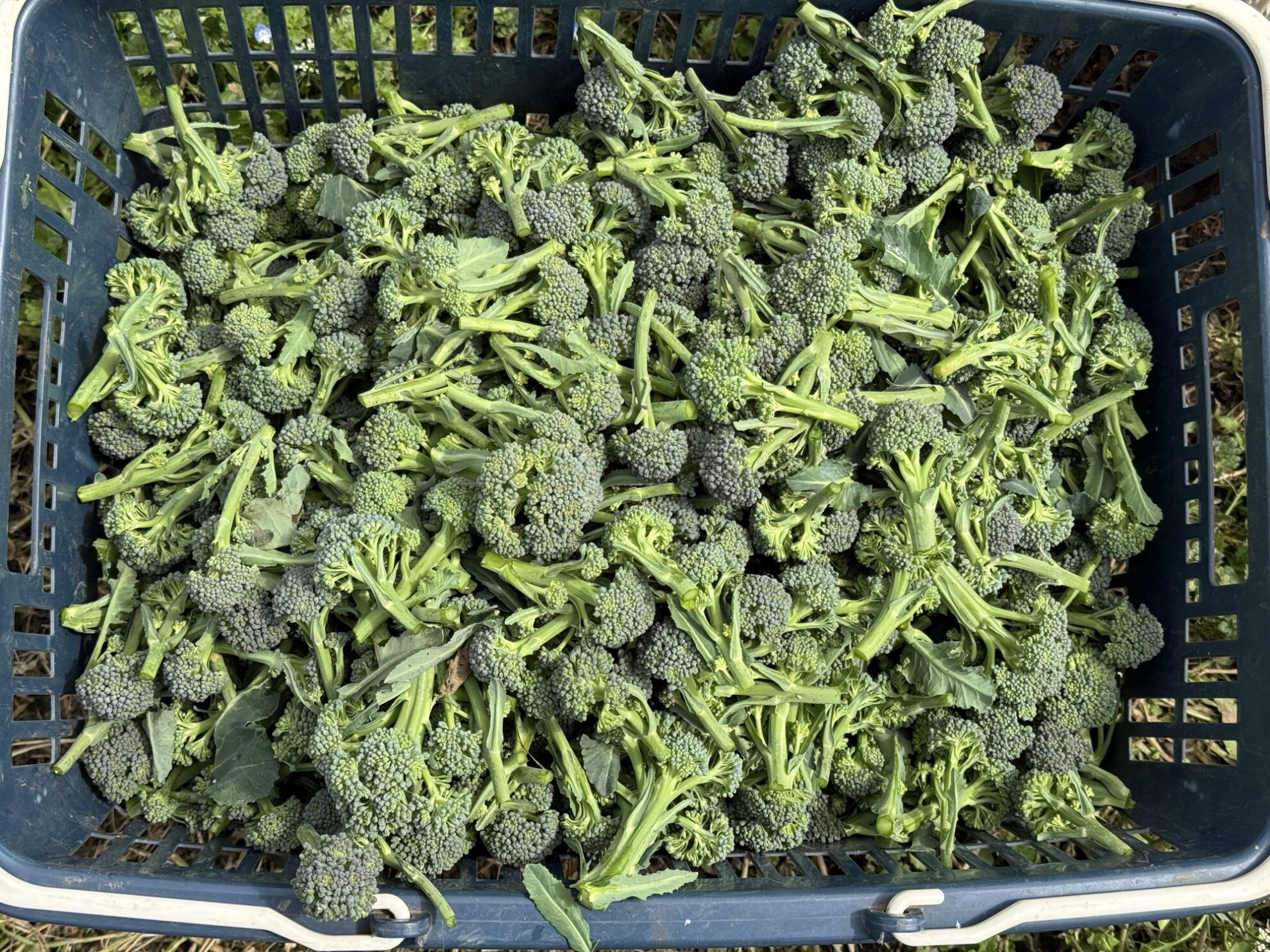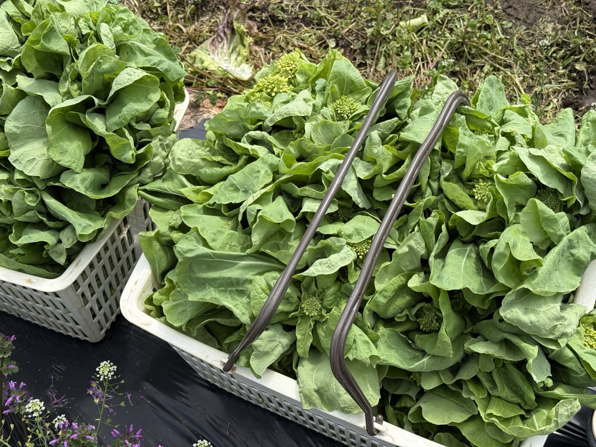 鈴木さん畑で、サニーレタス、白菜の菜花、ブロッコリー、スティックブロッコリーの収穫作業。