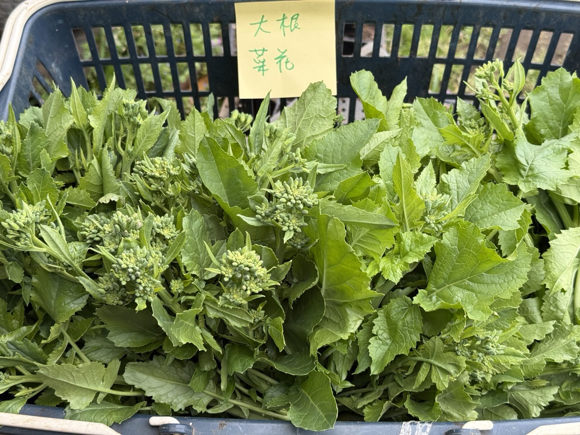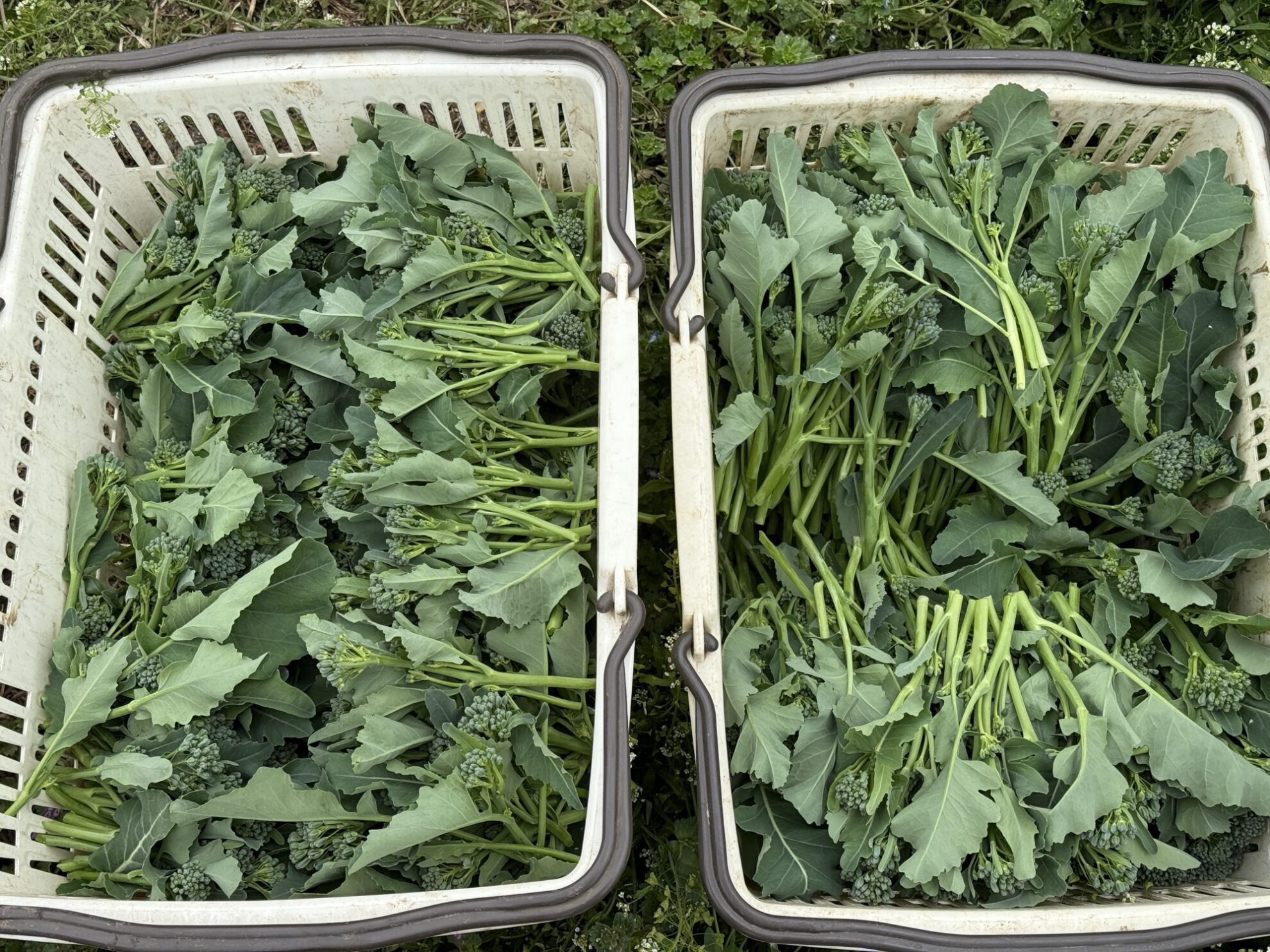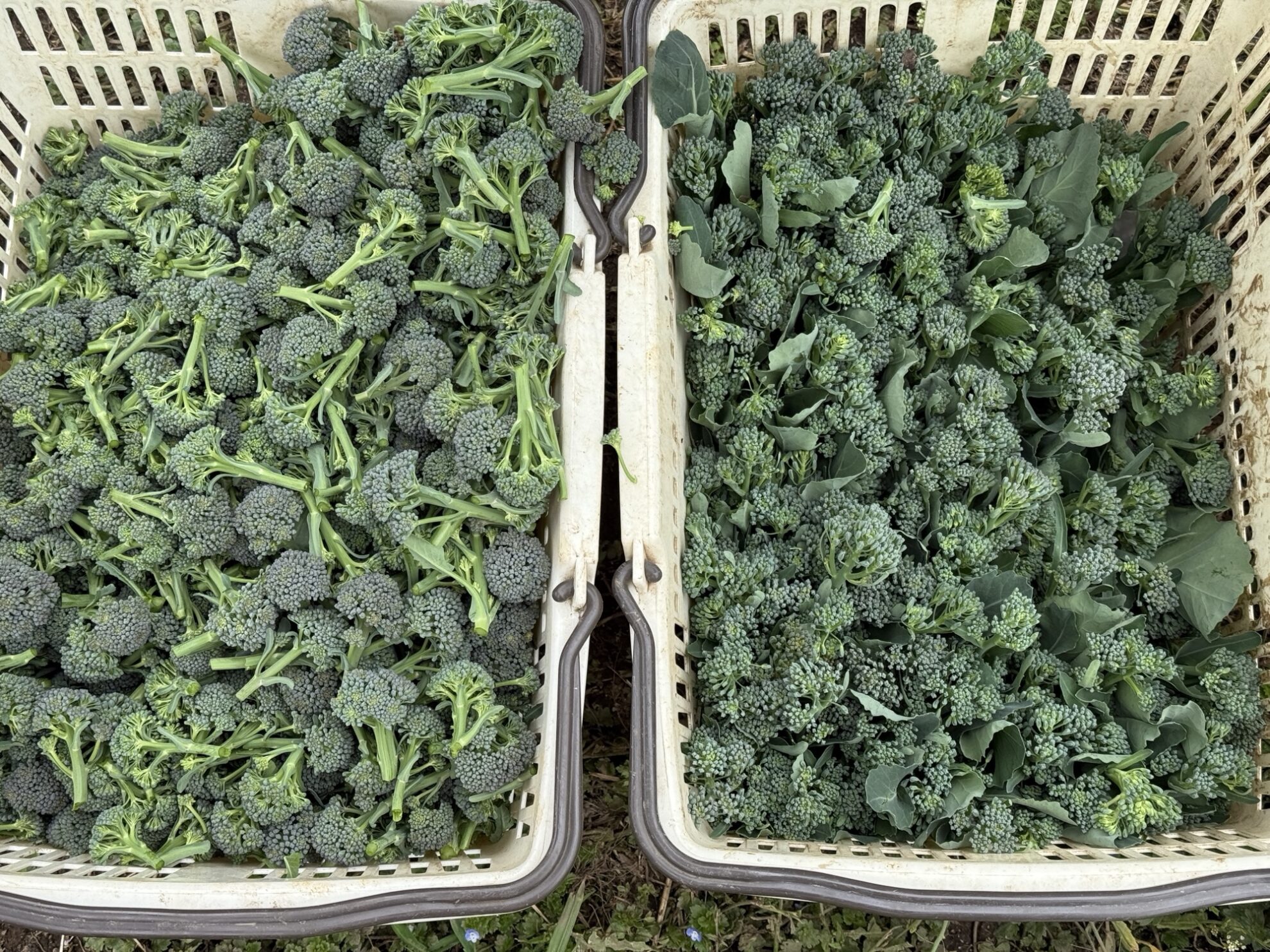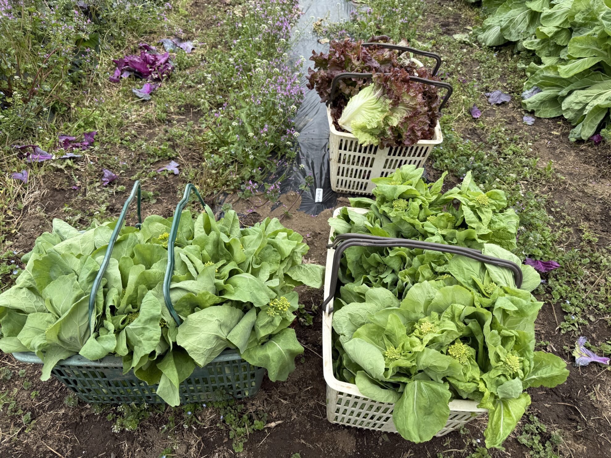 鈴木さん畑で、サニーレタス、白菜の菜花、ブロッコリー、スティックブロッコリーの収穫作業。