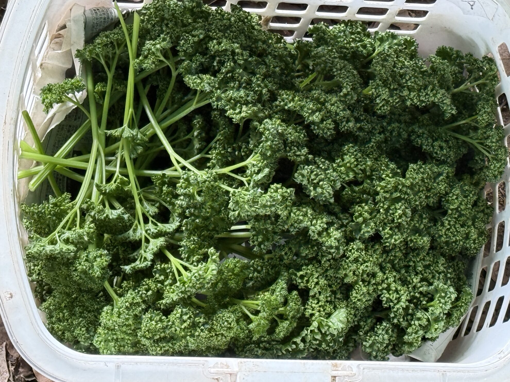 斉藤さん畑のビニールハウス内で、パセリの収穫作業。