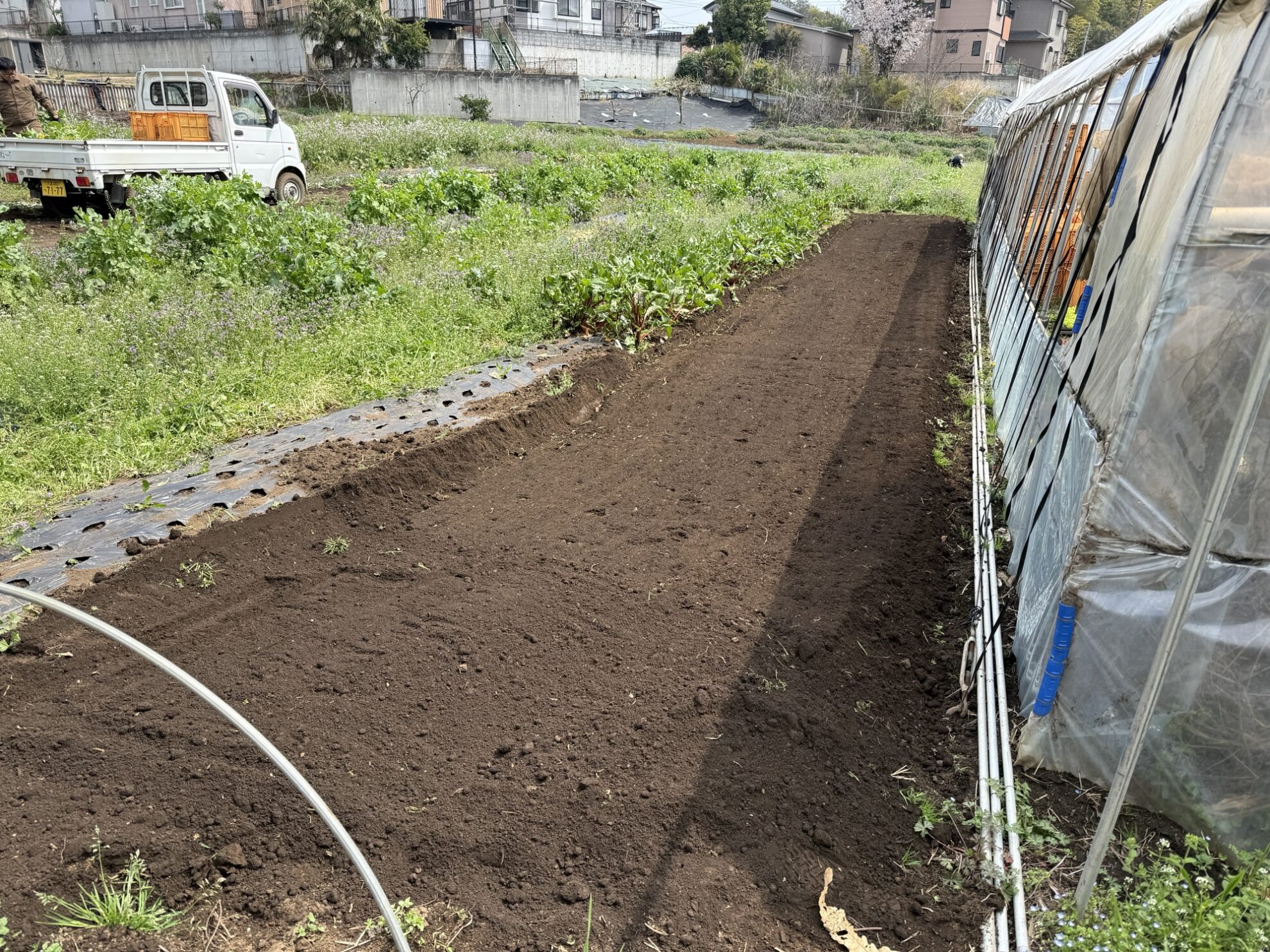 斉藤さんの上の畑で、ビニールハウス脇に鶏糞と牛糞堆肥と有機石灰を撒いて小型耕運機とトラクターで耕耘作業。