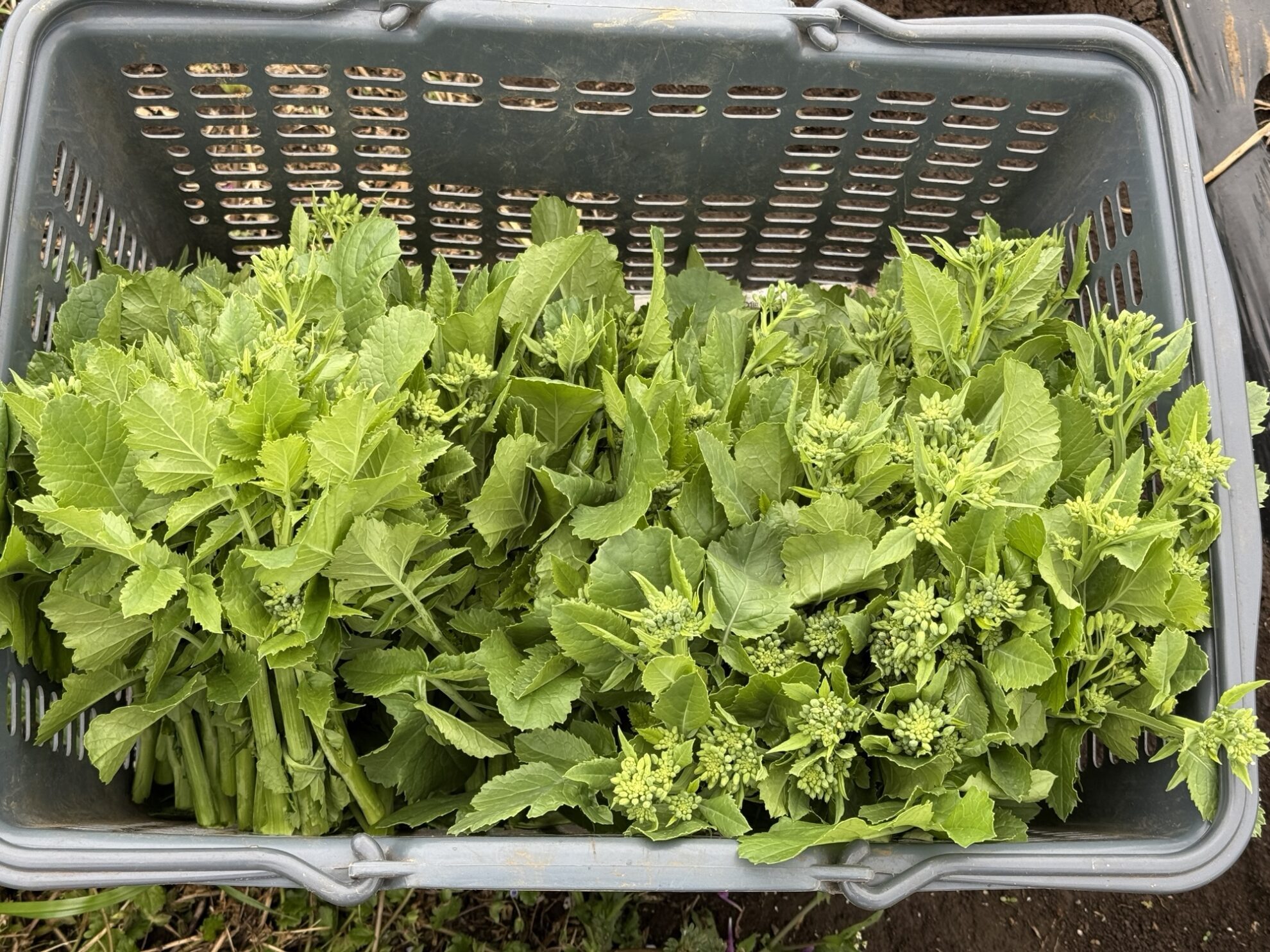 斉藤さんの最下段畑で、わさび菜の菜花、寒咲花菜、のらぼう菜の収穫作業。