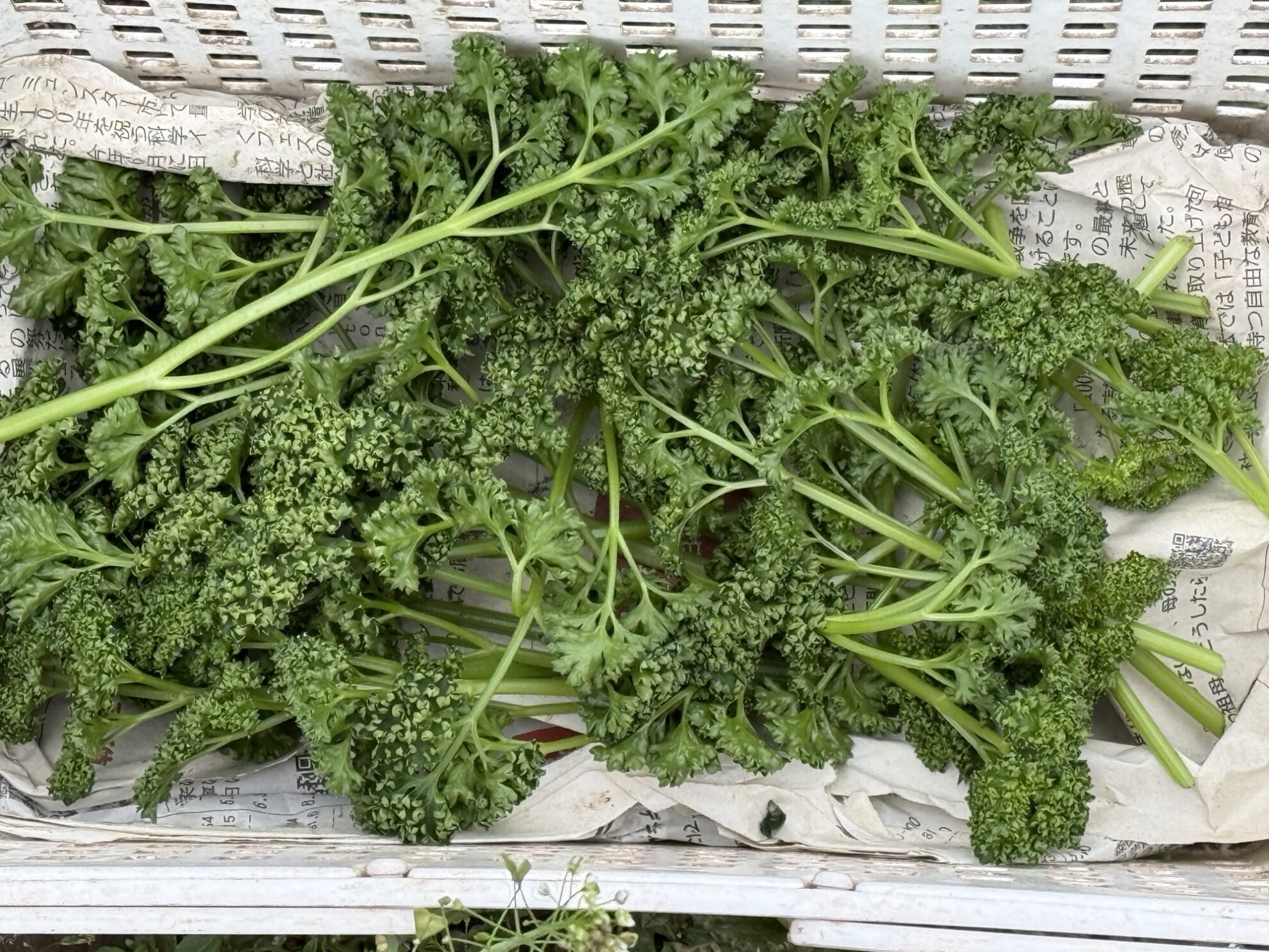 斉藤さん畑のビニールハウス内で、パセリの収穫作業。