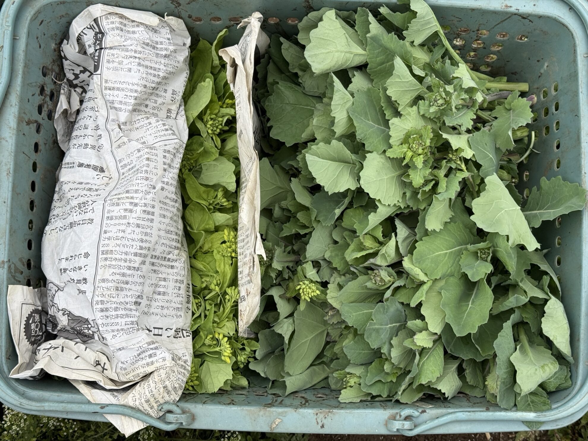 田中さんの上の畑で、小松菜の菜花、春菊の収穫作業。
