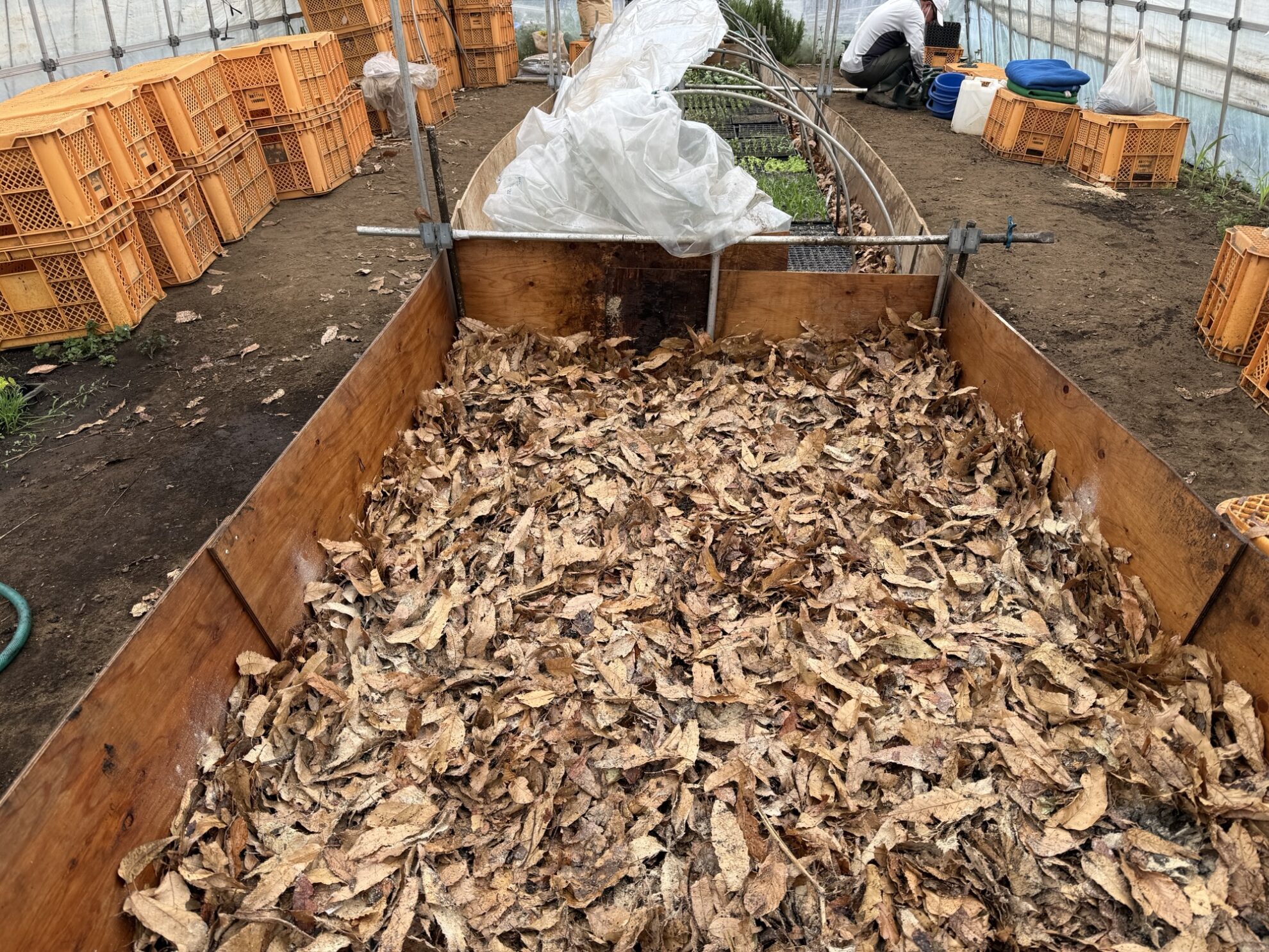 斉藤さん畑のビニールハウス内で、第二弾の踏み込み温床作り作業。