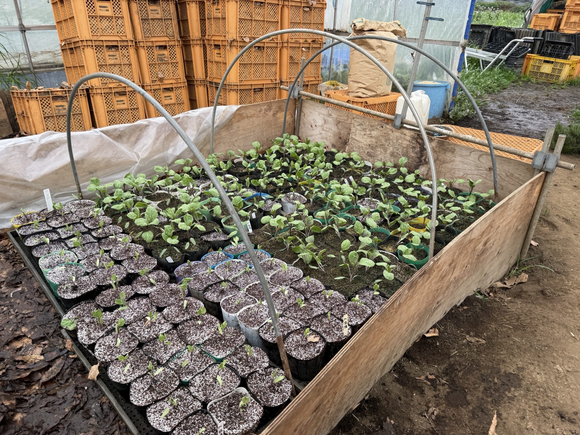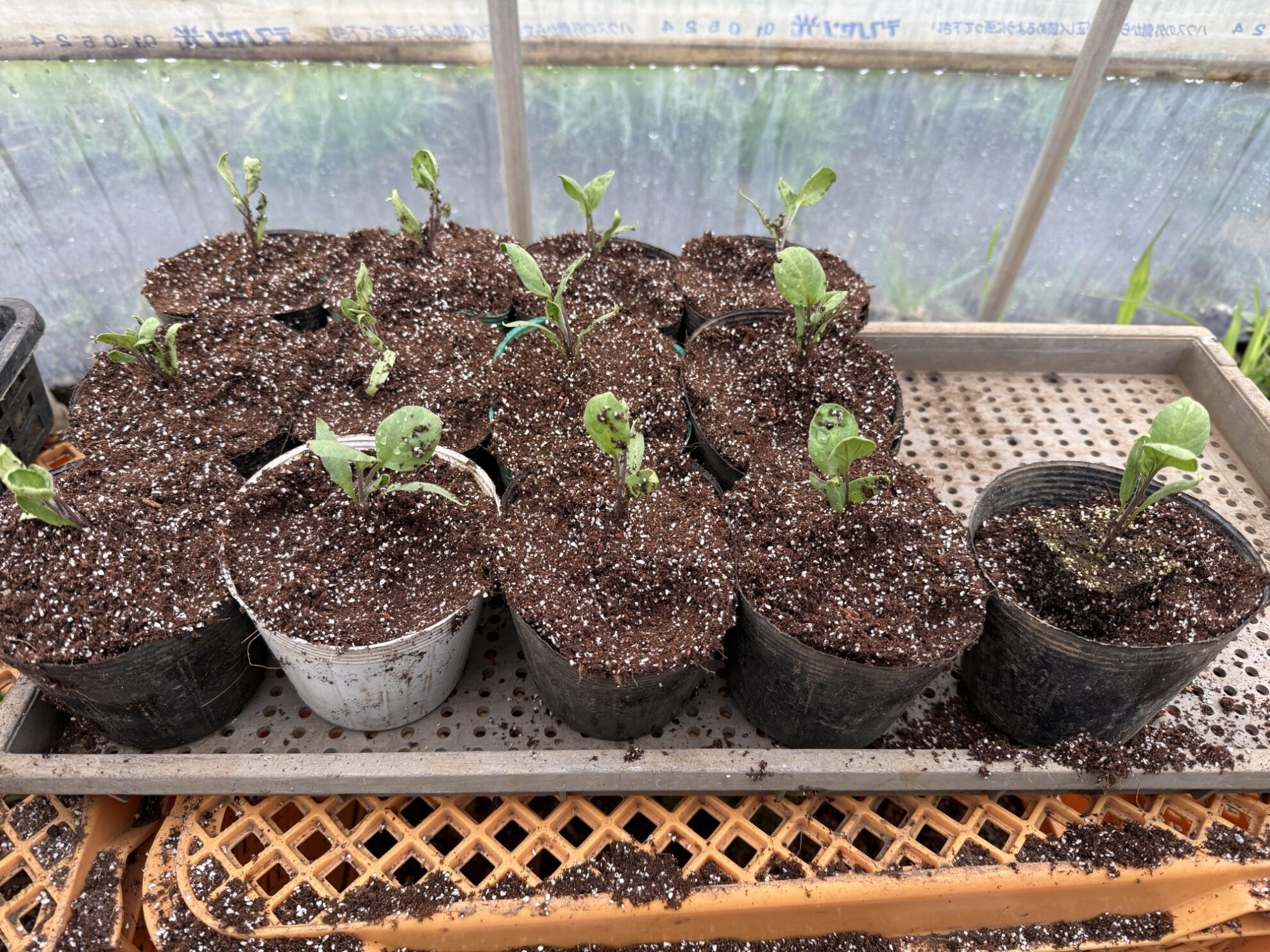 斉藤さん畑のビニールハウス内で、中長茄子(PC筑陽)の鉢上げ作業。