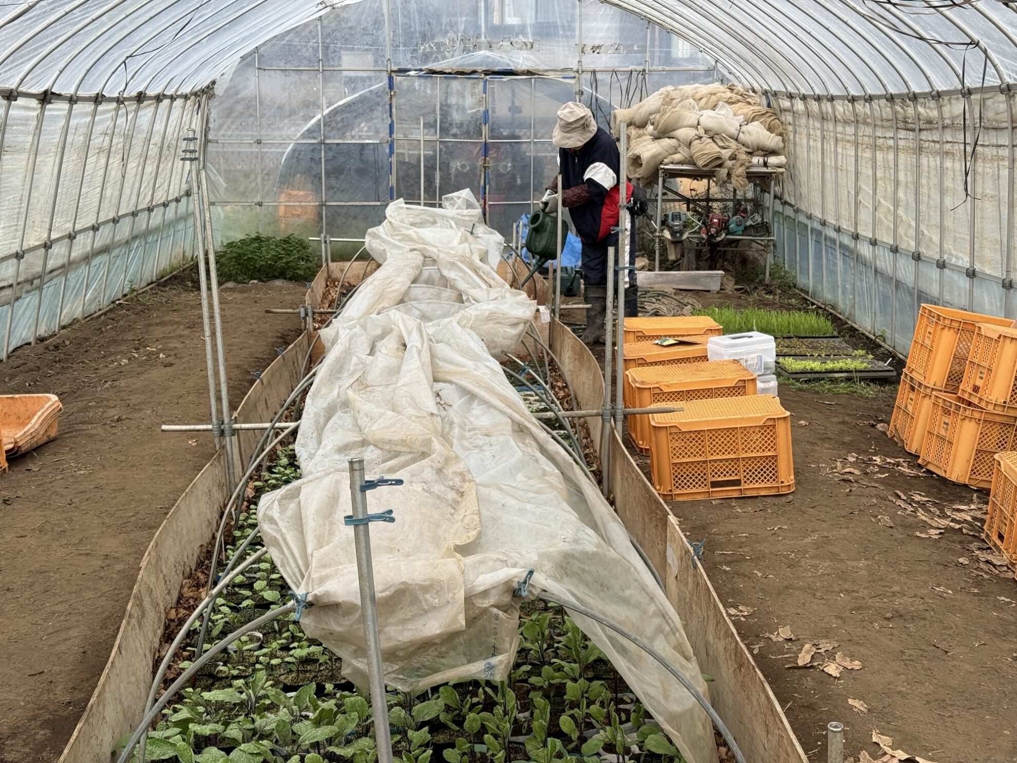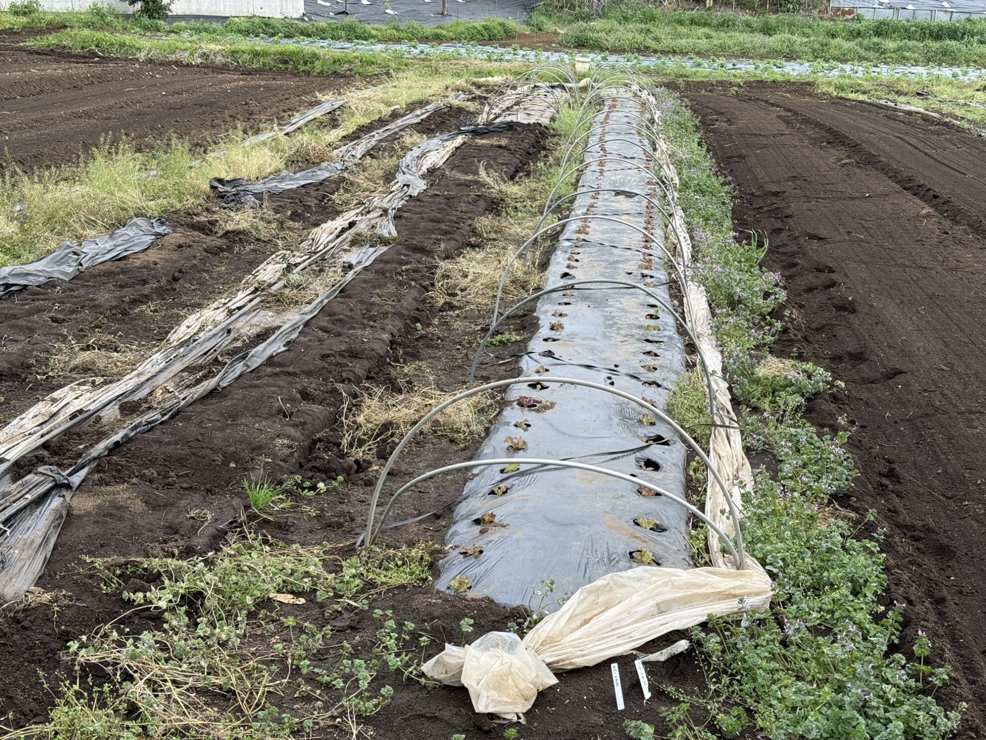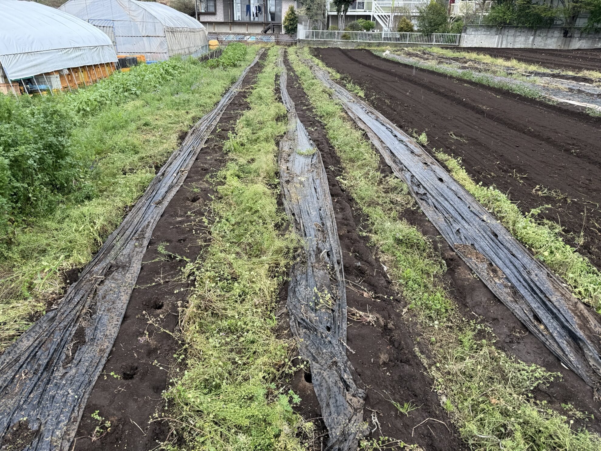 斉藤さんの中の畑で、大根類のマルチ剥がし作業。