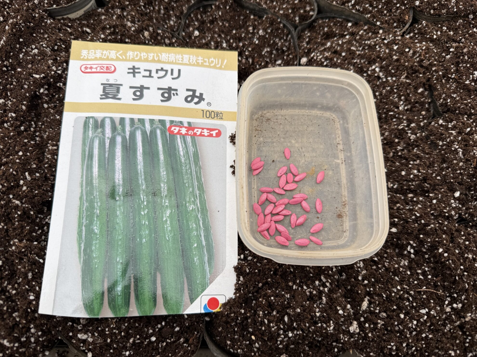 斉藤さん畑のビニールハウス内と、斉藤さんの上の畑の休憩所で、キュウリ(夏すずみ)の播種作業。