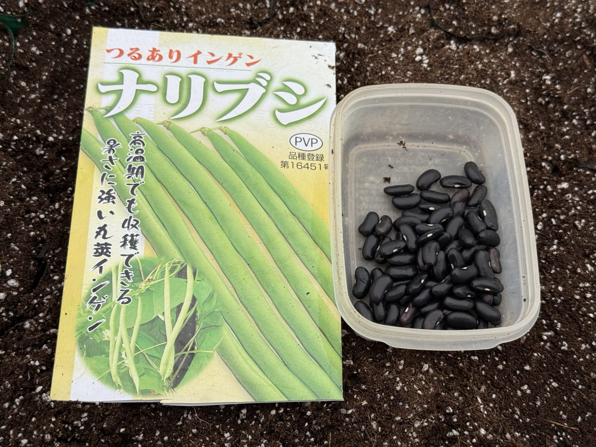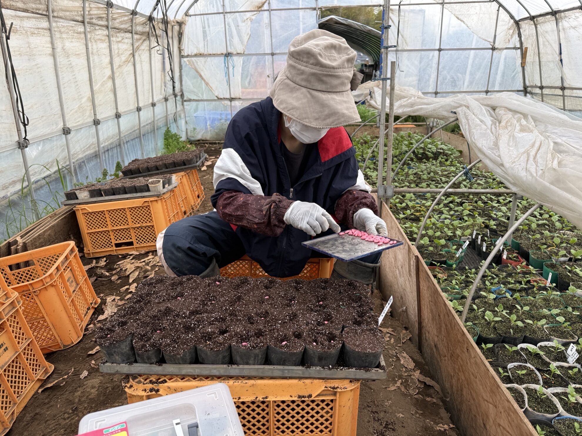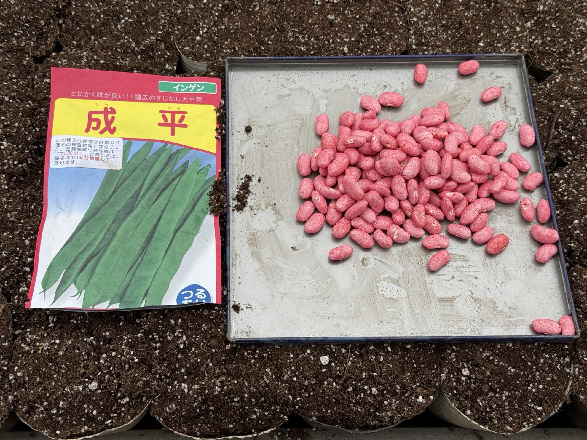 斉藤さん畑のビニールハウス内と斉藤さんの上の畑の休憩所で、キュウリ(夏すずみ)、成平インゲン、インゲン(ナリブシ)、青じその播種作業。