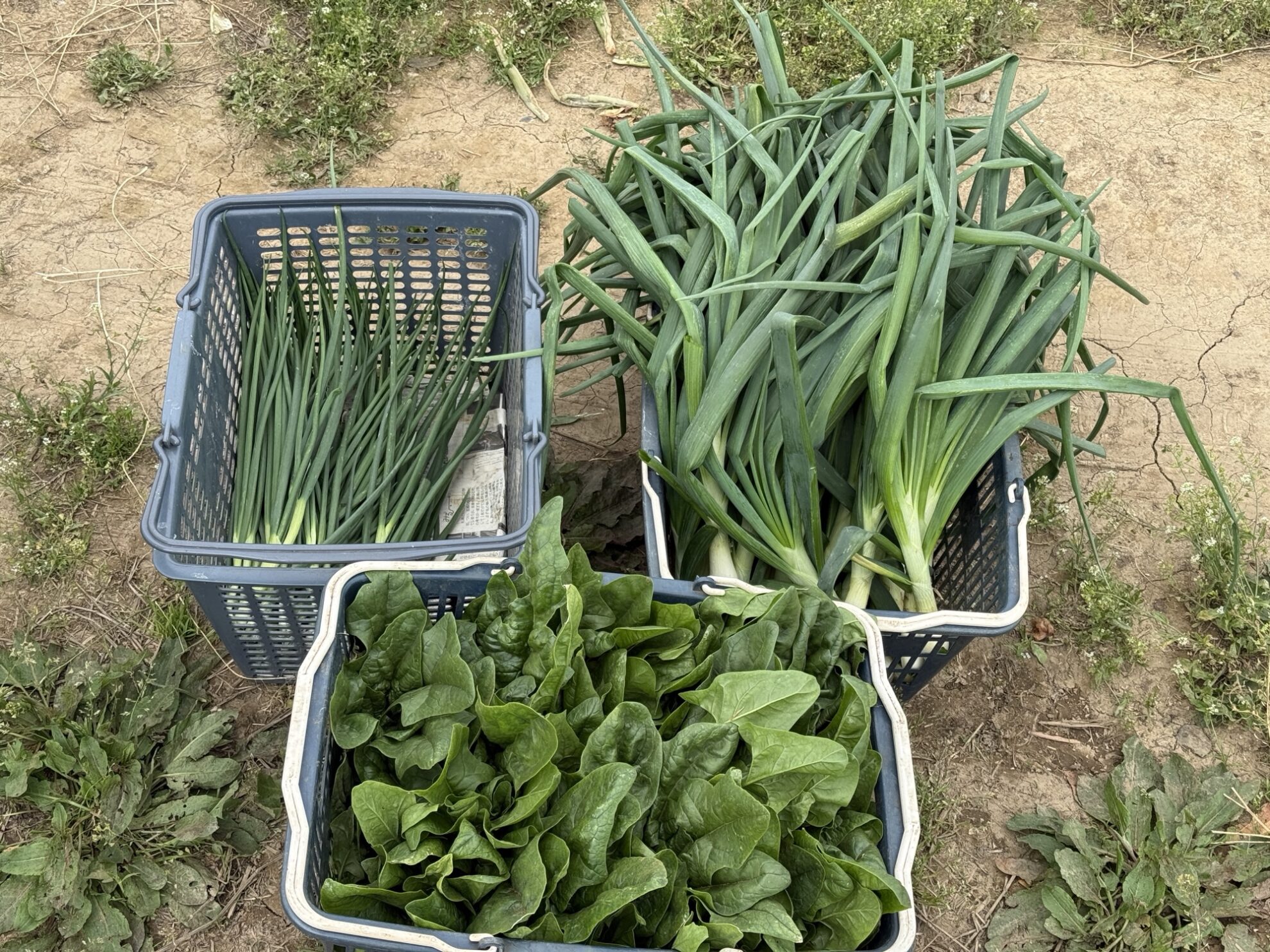 吉岡さん畑で、わけぎ、葉玉ねぎ、ほうれん草の収穫作業。