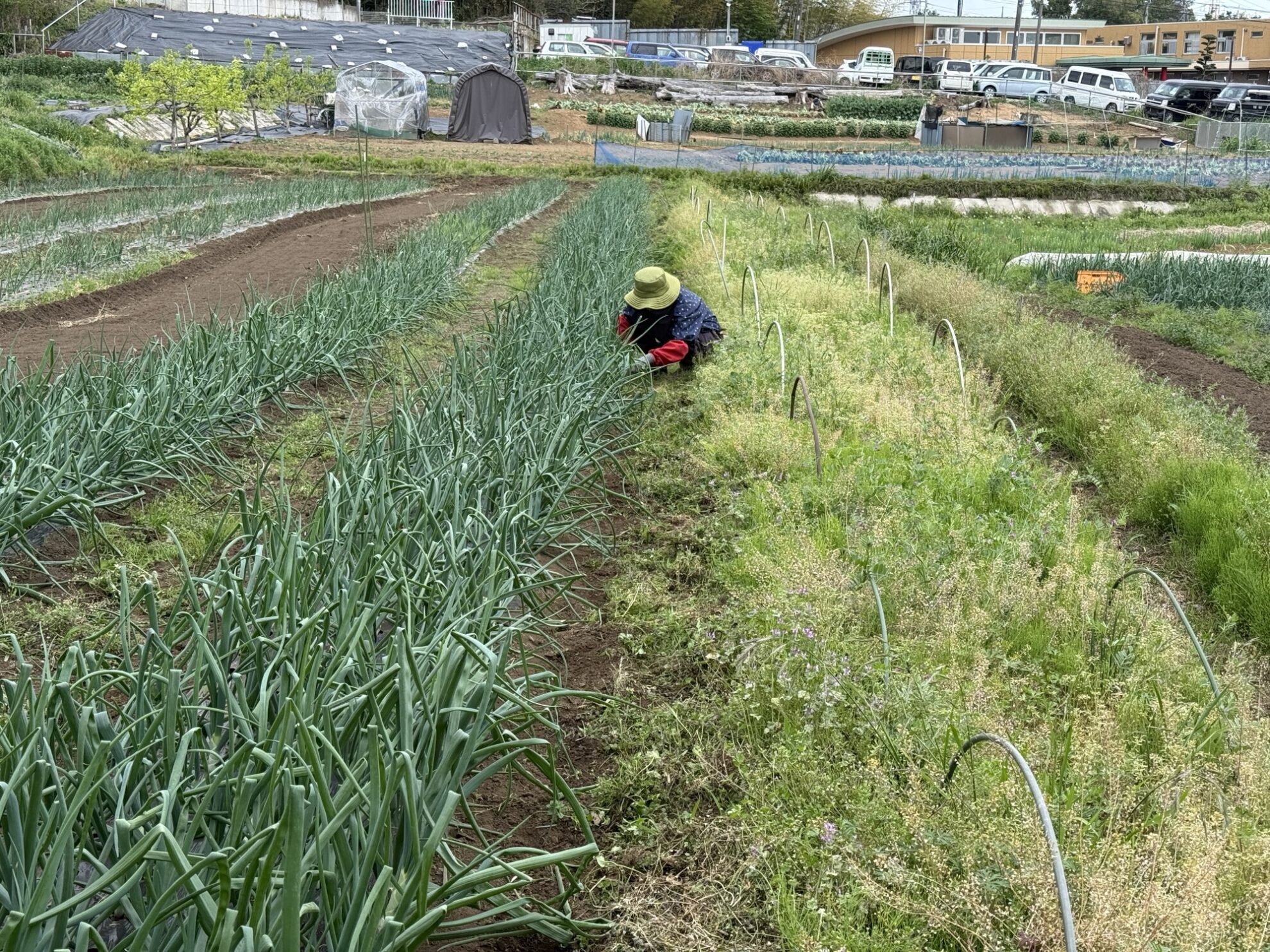 斉藤さんの中の畑で、赤玉ねぎ周りの除草作業。