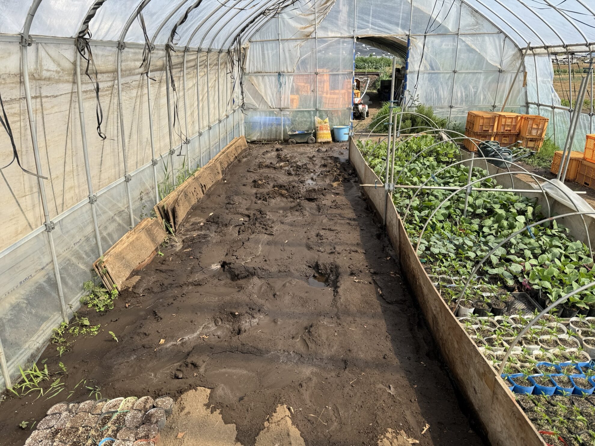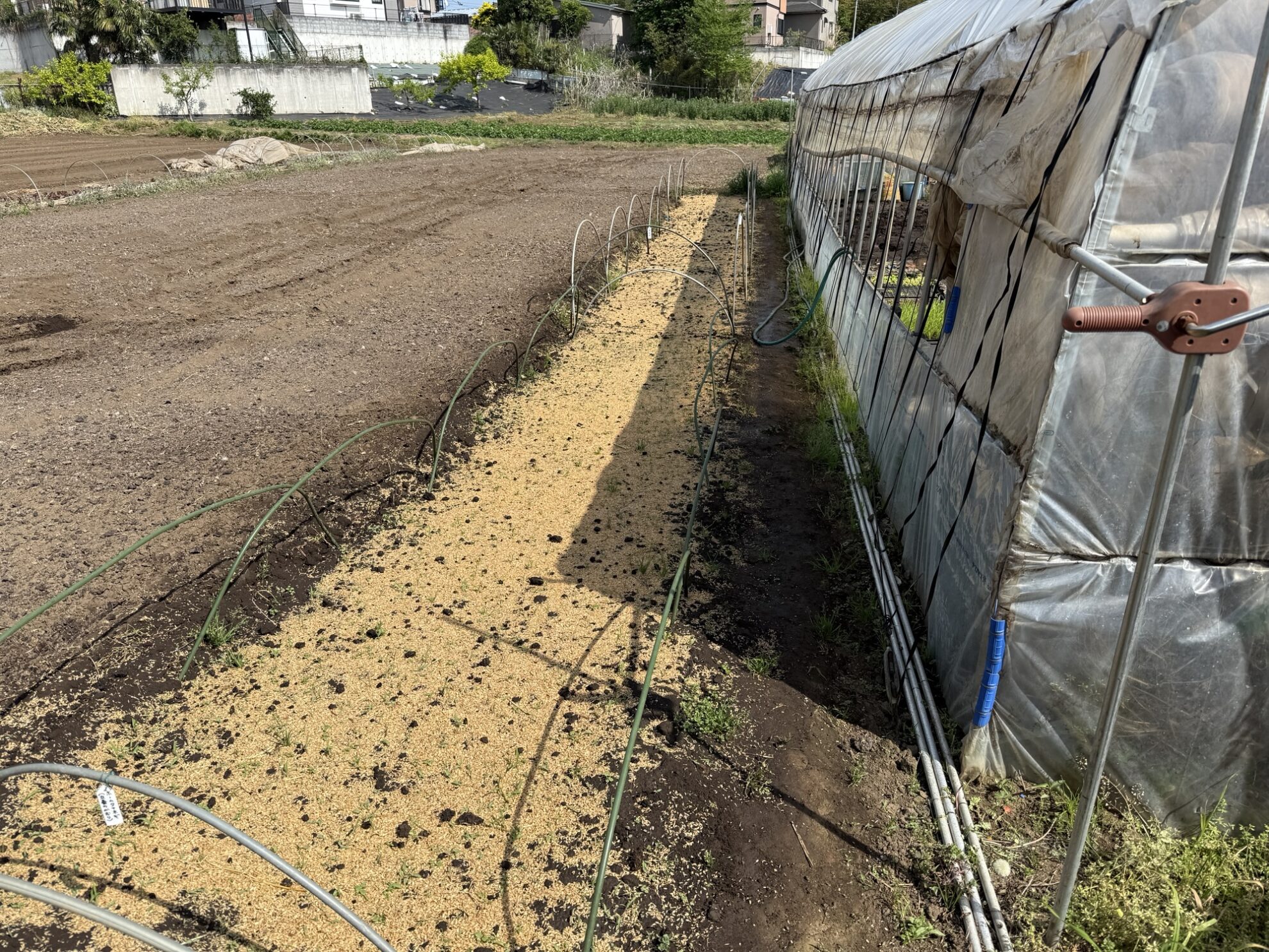 斉藤さん畑のビニールハウス内で、リーキの苗床予定地の土の乾燥が酷かったので、井戸水ポンプを使用して散水作業。