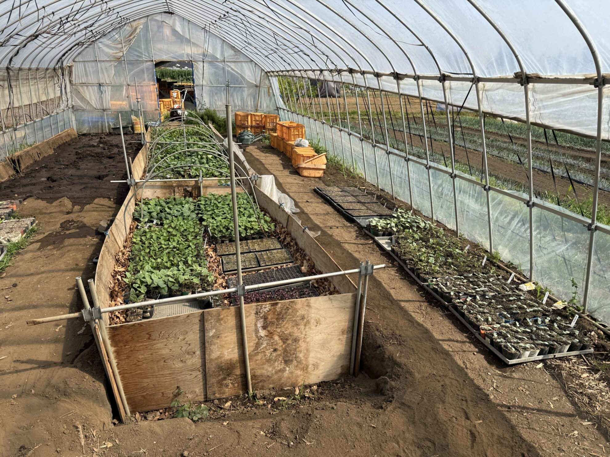 斉藤さん畑のビニールハウス内で、夏野菜の苗、ローズマリー、パセリに水やり作業。