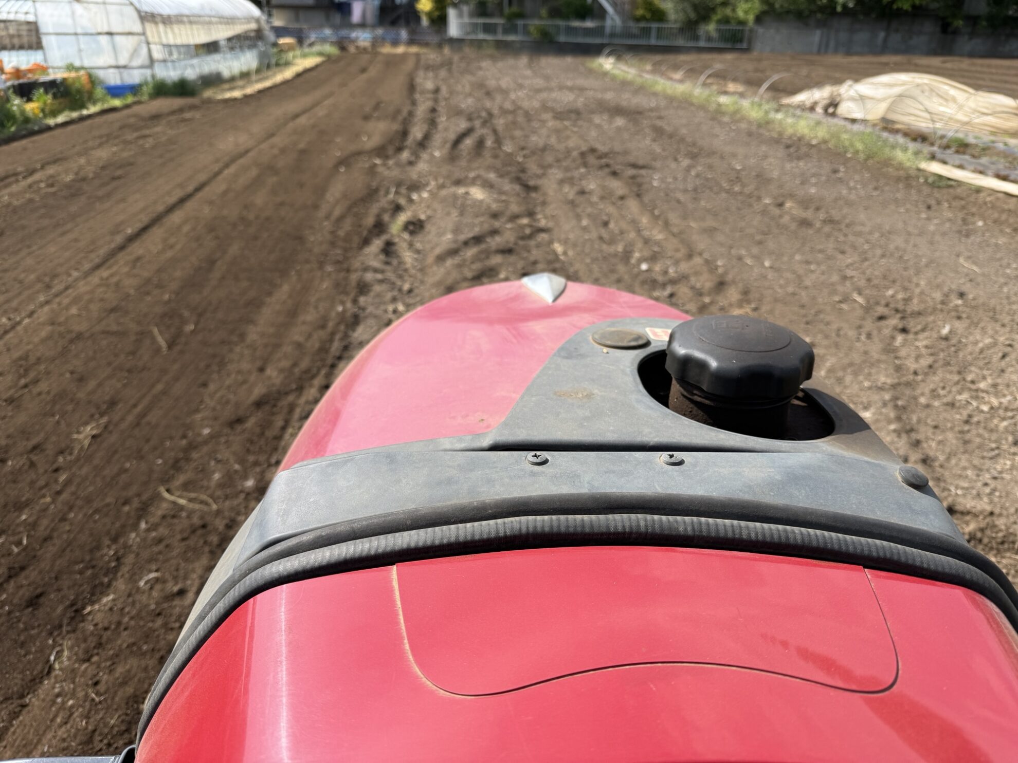 斉藤さんの上の畑の一部に鶏糞を撒いてトラクター耕耘作業。