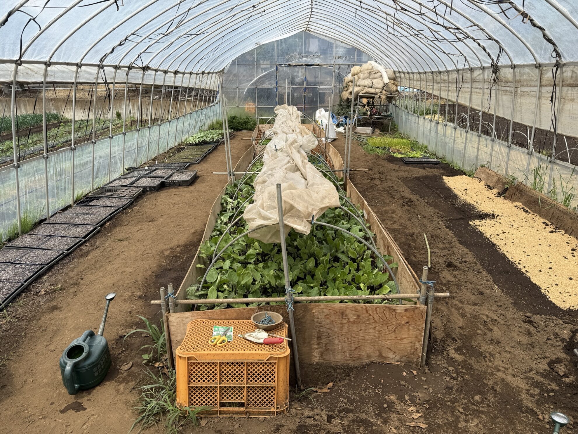斉藤さん畑のビニールハウス内で、夏野菜の苗、ローズマリー、パセリに水やり作業。