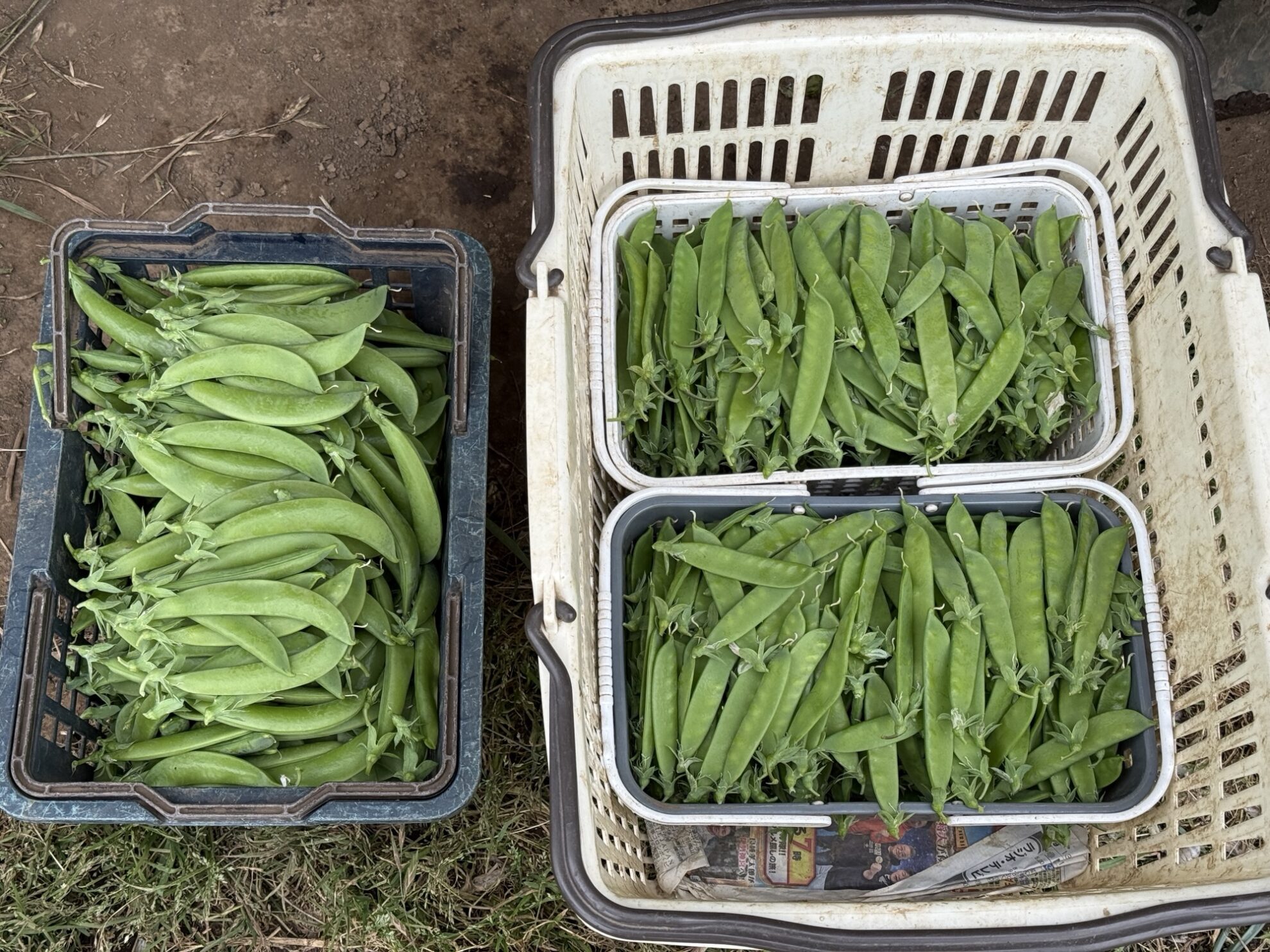 斉藤さんの下の畑で、ニンニクの芽、絹さや、スナックエンドウ、エシャレットの収穫作業。